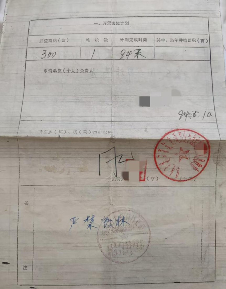 1994年,代玉(化名)拿到的开荒审批表,上面备注“严禁毁林”。受访者供图