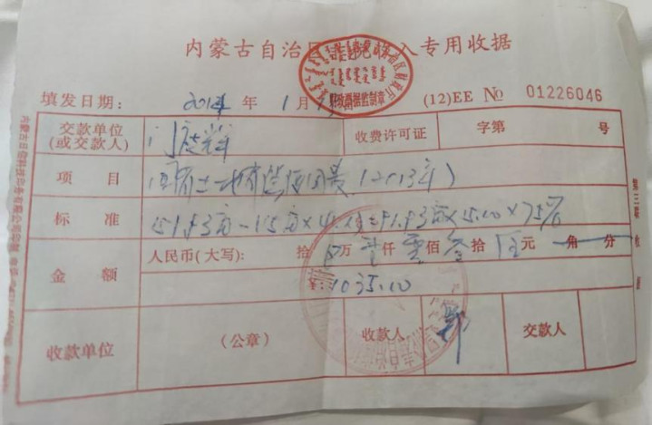 2014年,老门缴纳国有土地有偿使用费的票据,收款单位为托扎敏乡乡政府。新京报记者 赵敏 摄