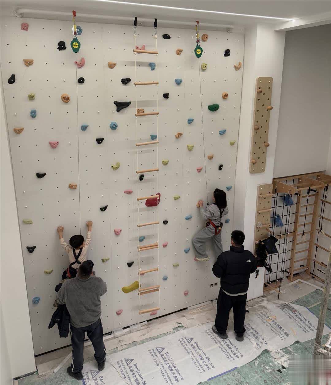 如果不算天井窗的位置,这层高也有差不多五米左右,宝爸宝妈利用一整面高墙安装攀岩墙,嵌入各种儿童攀岩块的同时,也可以根据这洞洞板来随时变更,既让难度可以调整,又解决了长时间玩新鲜感不足的问题。