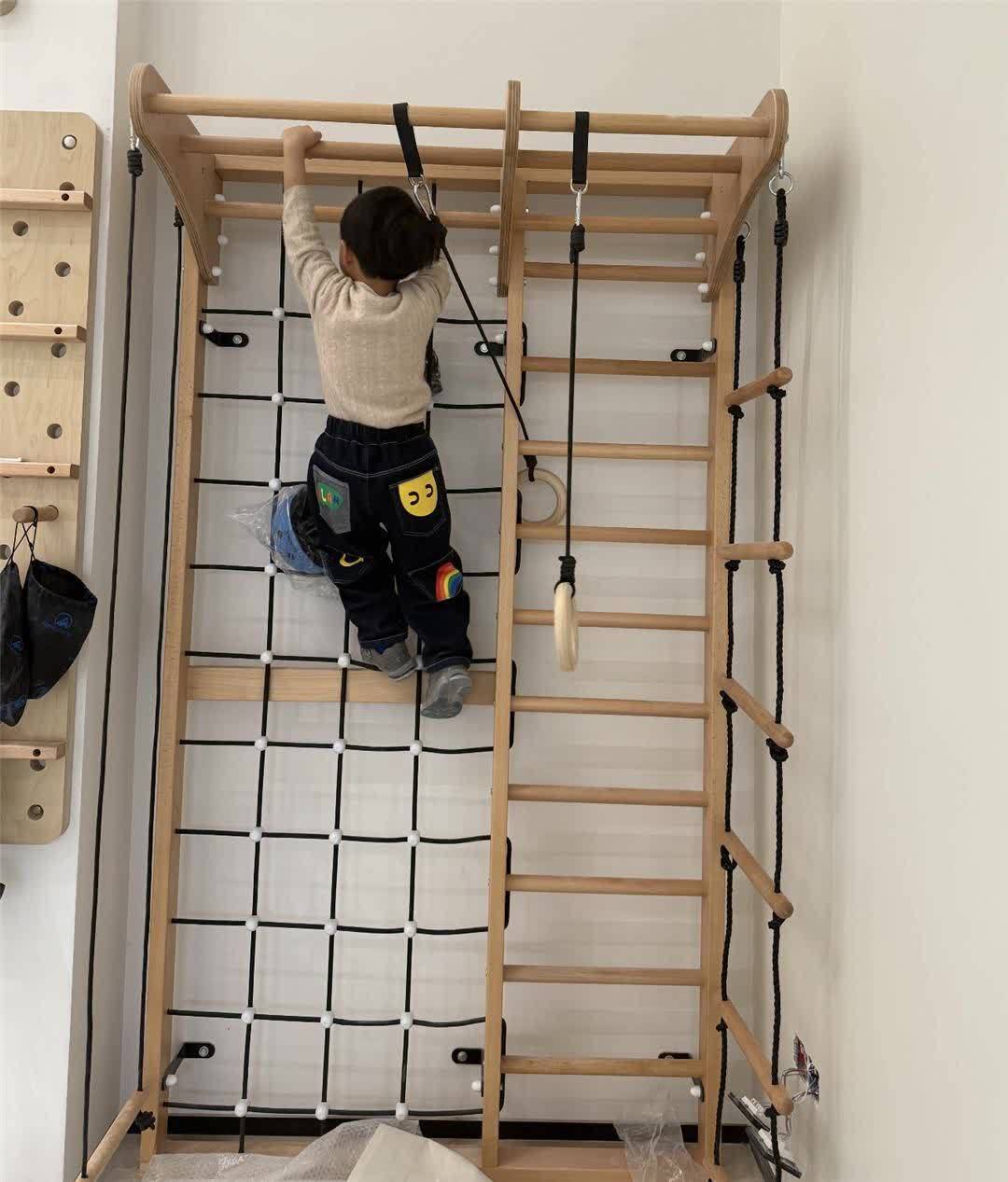 攀岩墙旁边的角落里,还放了一组小小的爬梯绳架,也可以当做孩子的“第二攀爬选择”,充分发挥孩子运动天赋的同时,也能消耗他过剩的精力,让带娃过程更加轻松一些,大人孩子都高兴,算是一举两得了~