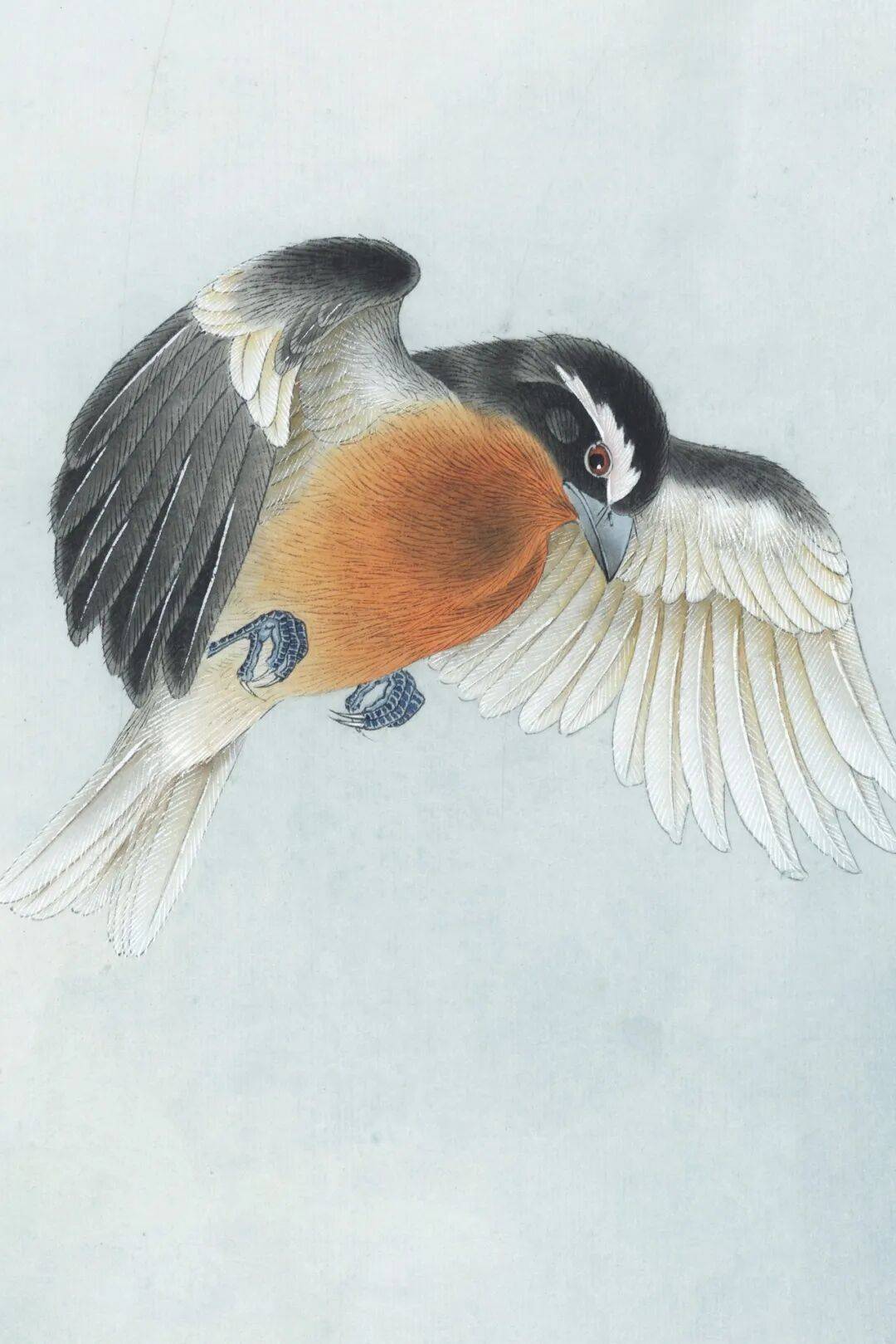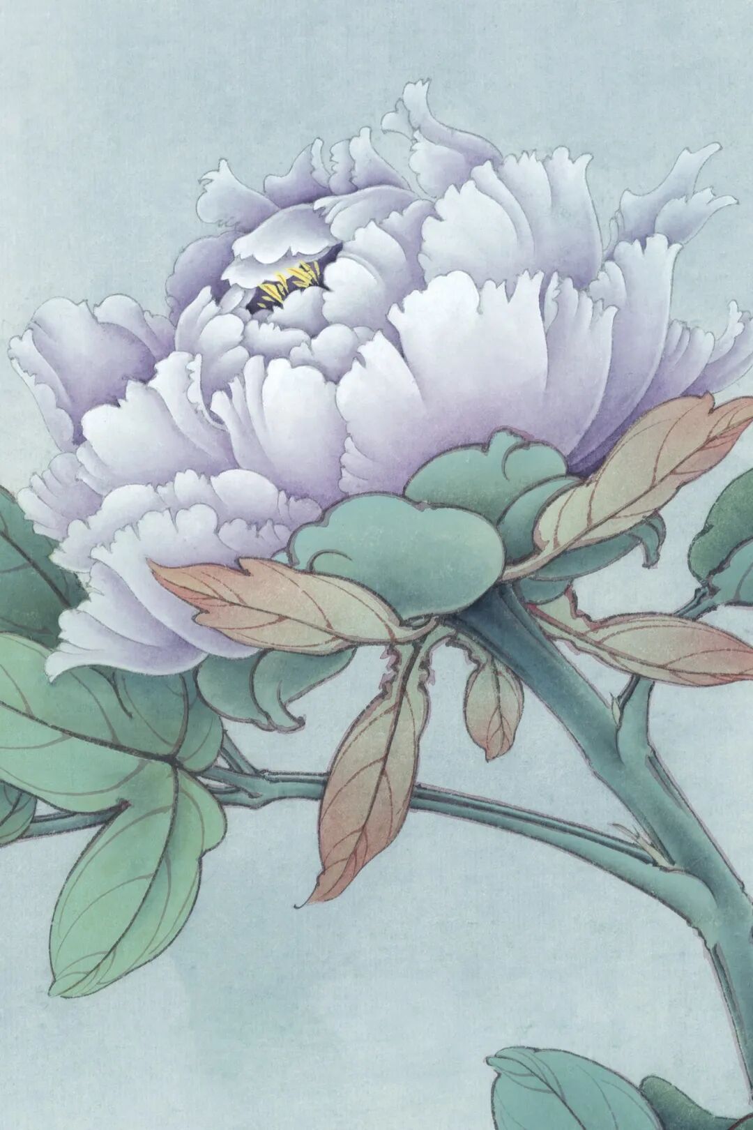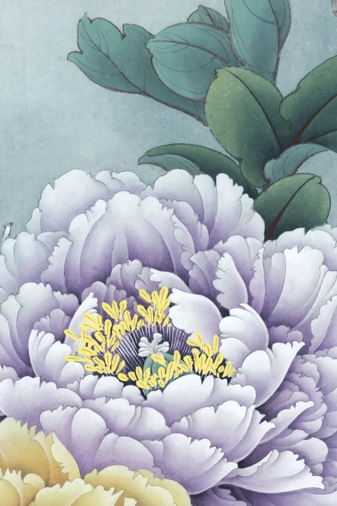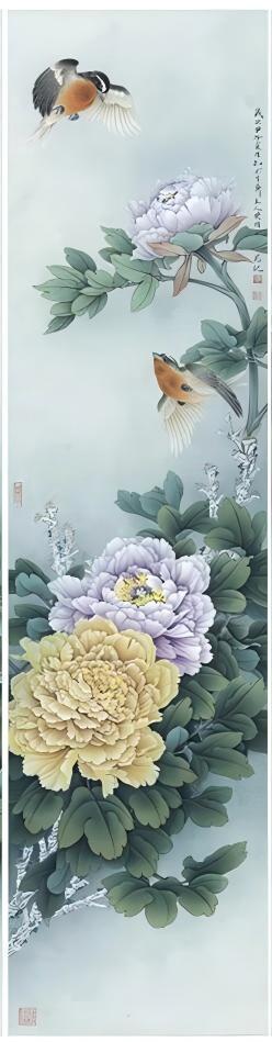 背景是淡淡的浅蓝色,干净又纯粹,把牡丹和小鸟衬托得更加突出。整幅画工笔细腻,色彩搭配和谐自然,既有牡丹的雍容华贵,又有小鸟的活泼俏皮。