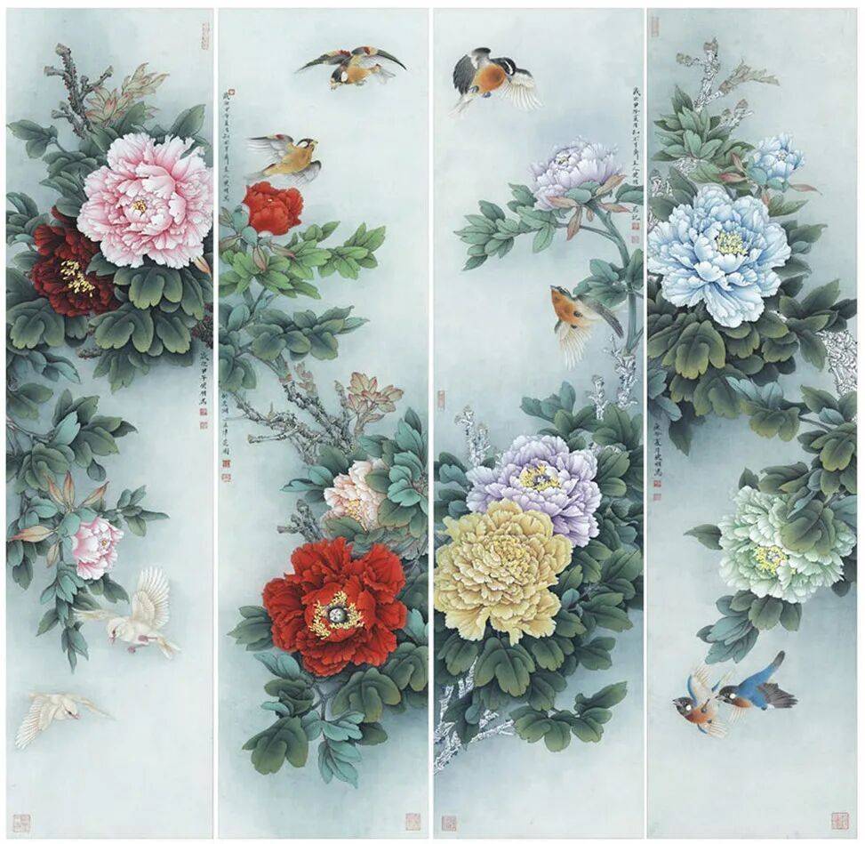 宁波股票配资网官网 李晓明《富贵天香》四条屏(三):工笔绘就的诗意花境