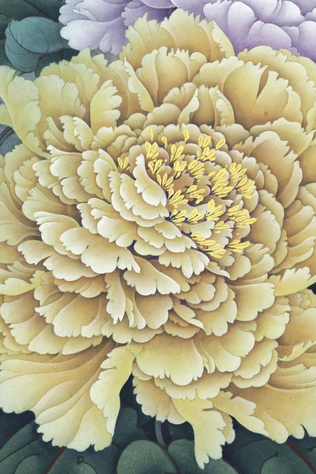 李晓明这幅《富贵天香》四条屏之三,一打眼就美得让人挪不开视线。画面里,牡丹花大放异彩,淡紫色的高贵优雅,像宫廷里的贵妇人;米黄色的温婉柔和,似邻家温柔的大姐姐。花瓣层层包裹,细腻又饱满,仿佛轻轻一碰就会颤动起来。