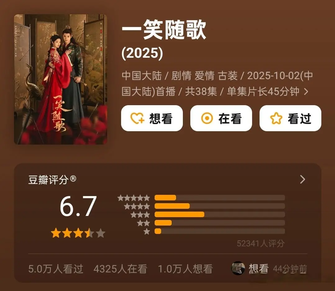 但即便宣发拖了后腿,《一笑随歌》的口碑却一点不水,稳稳拿下6.7分,放在同类型古装剧里,绝对算得上中上等水平。