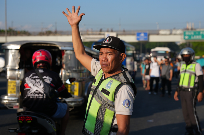 4月15日,在菲律宾奎松城,一名交通指挥员协调车辆通行。 新华社/美联