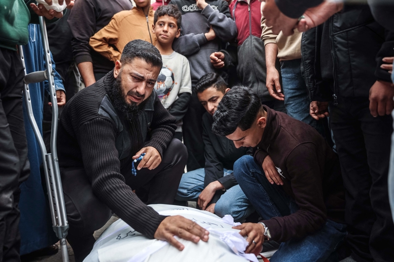 4月15日,在加沙城,人们在以色列袭击遇难者的遗体旁哀悼。 新华社/法新