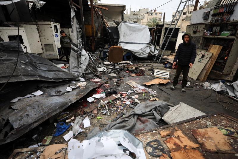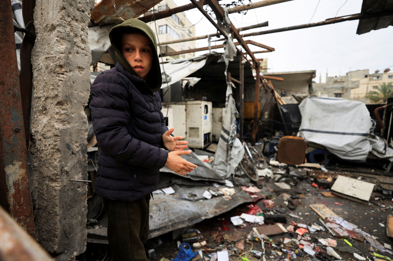 4月15日,在加沙城,一名巴勒斯坦儿童查看遭以色列袭击损毁的房屋。 新华社/路透