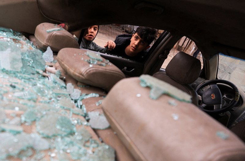 4月15日,在加沙城,巴勒斯坦儿童查看遭以色列袭击损毁的车辆。 新华社/路透